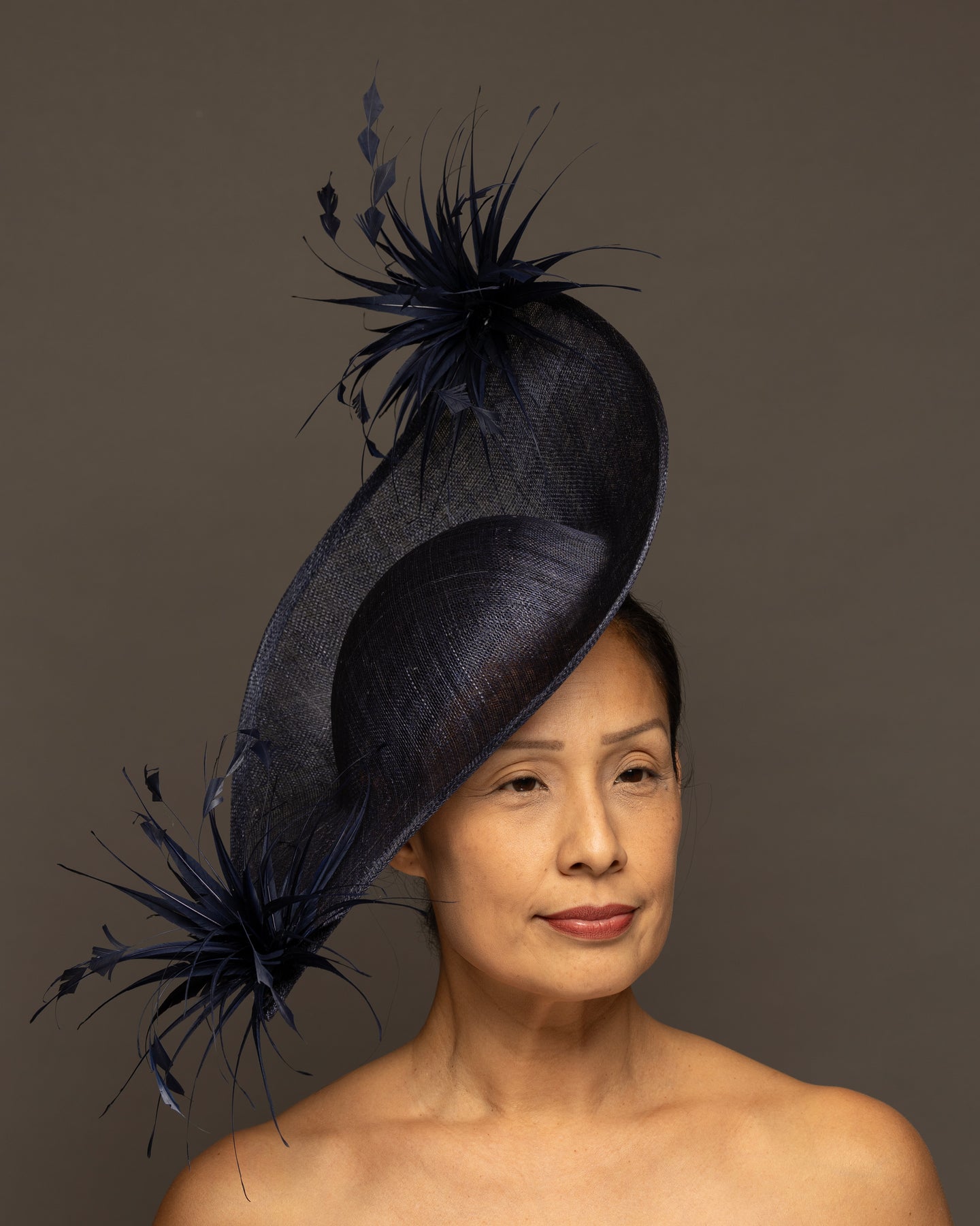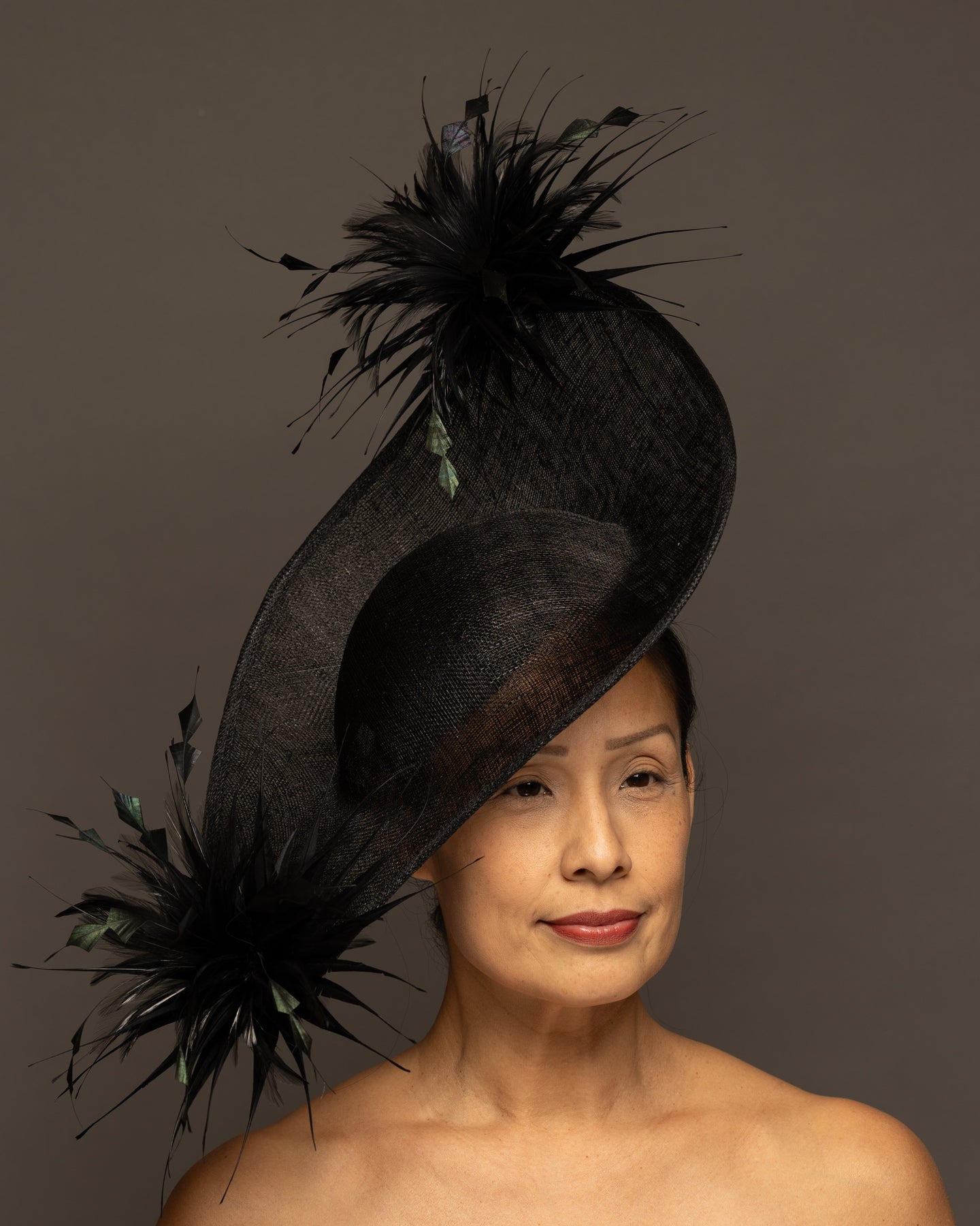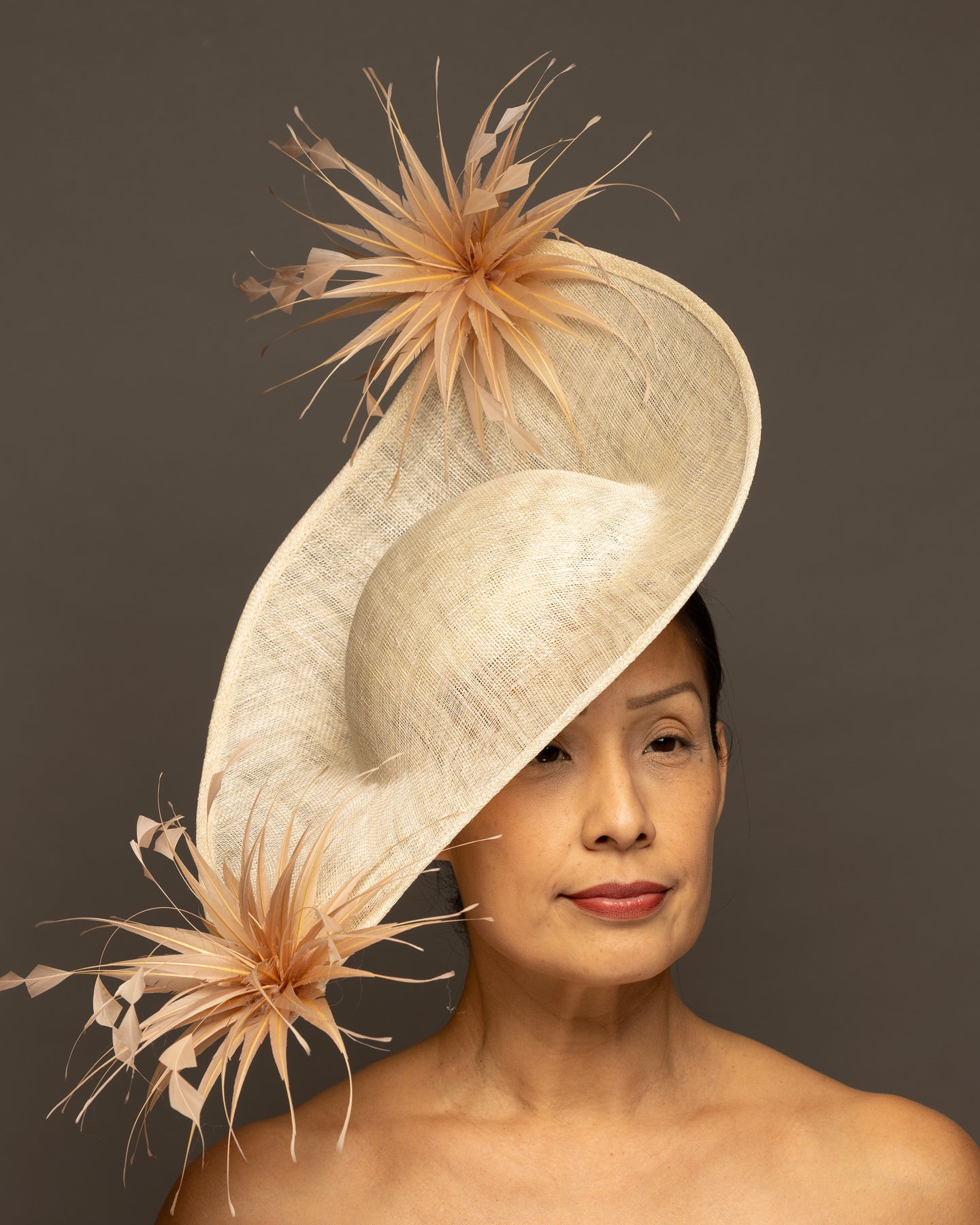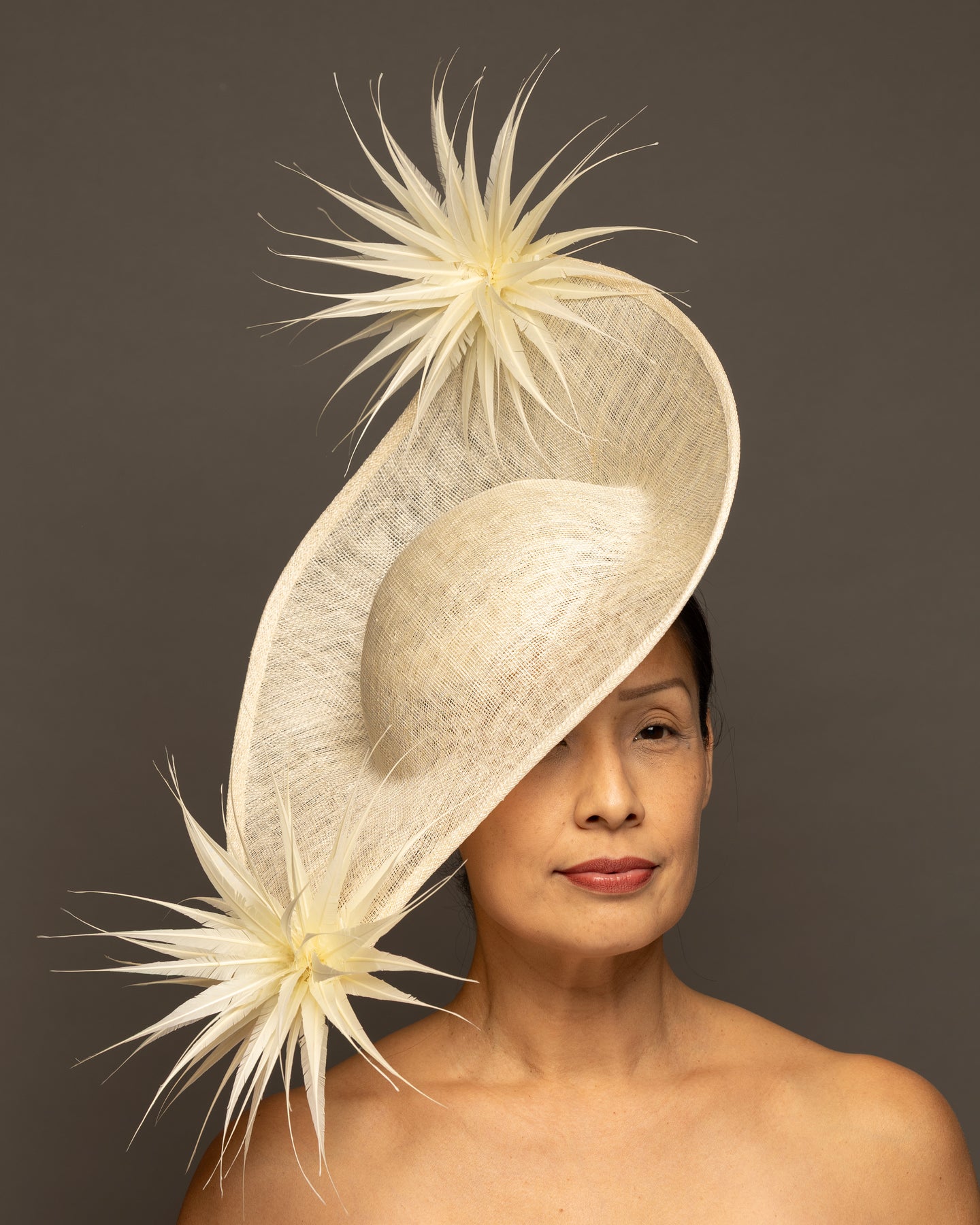 The foundation is crafted from premium sinamay, featuring a deep, woven texture that adds organic depth. The base is expertly molded into a dramatic, asymmetrical curve that sweeps elegantly across the brow and upwards toward the crown.