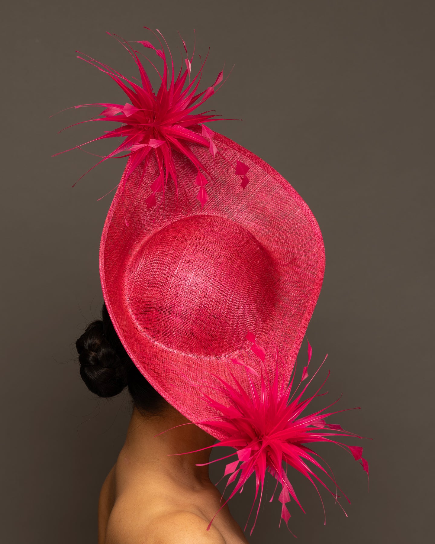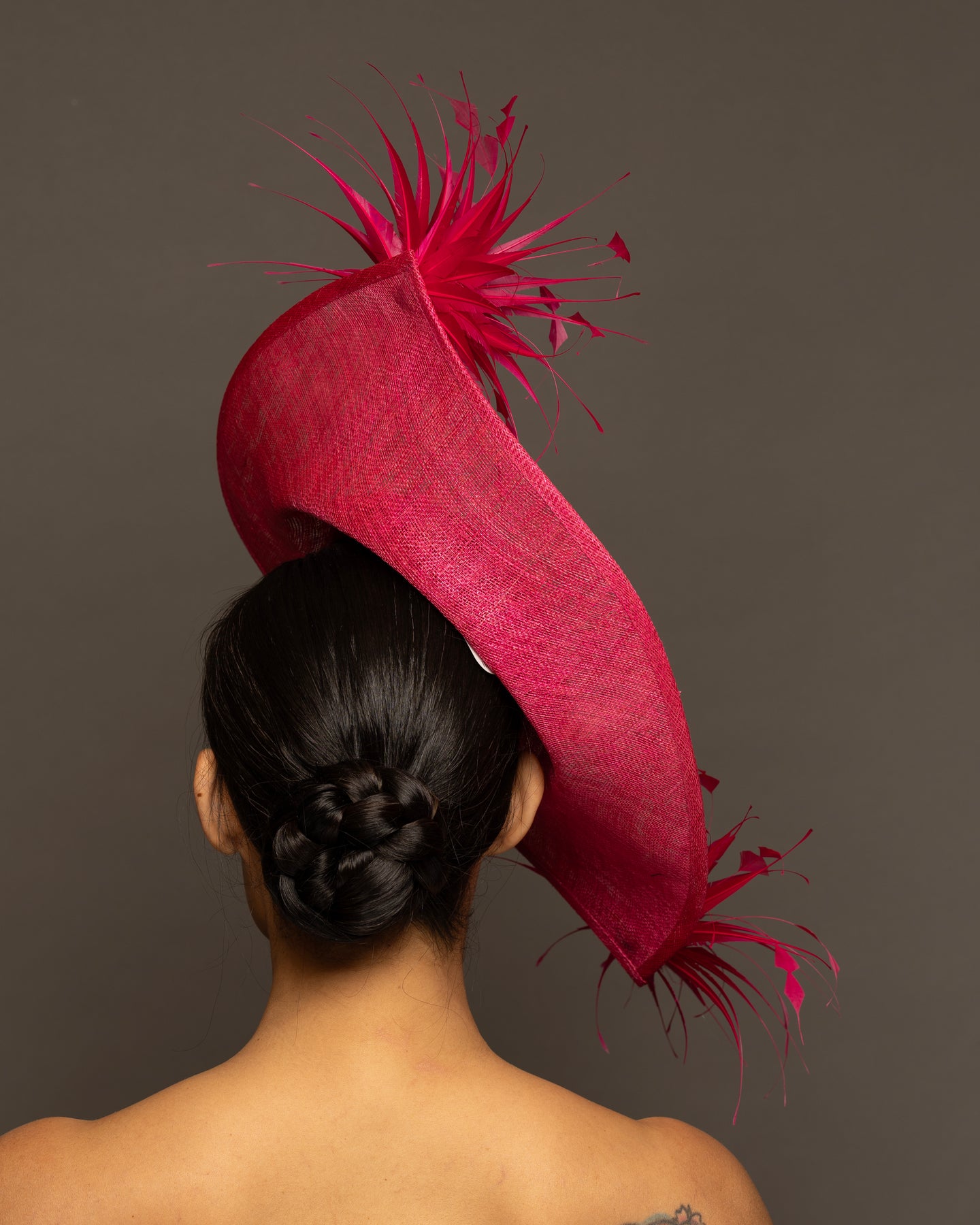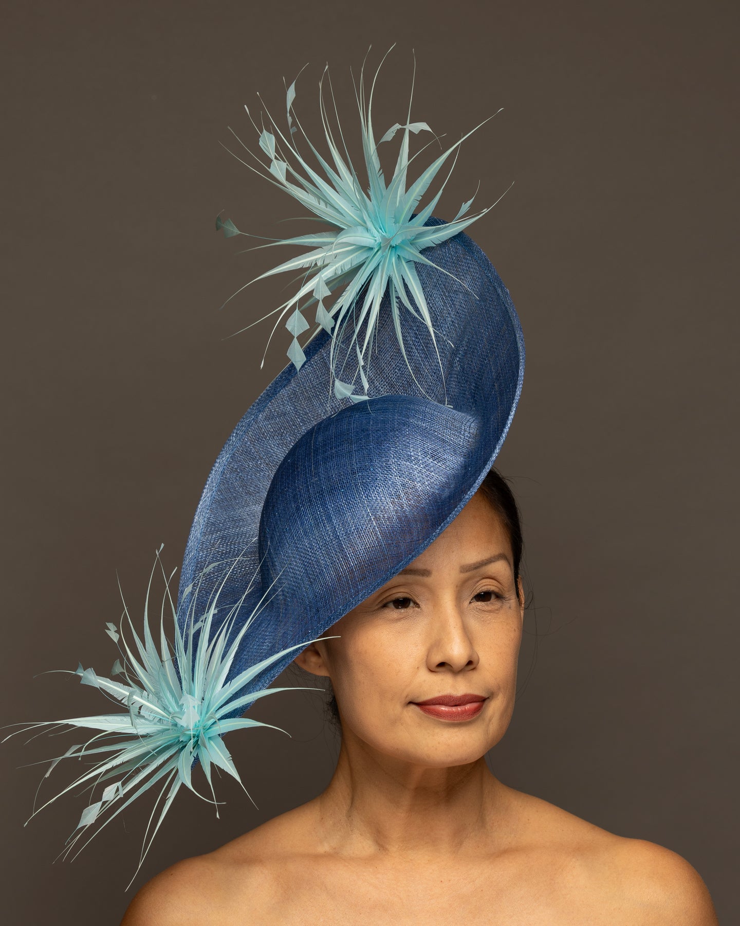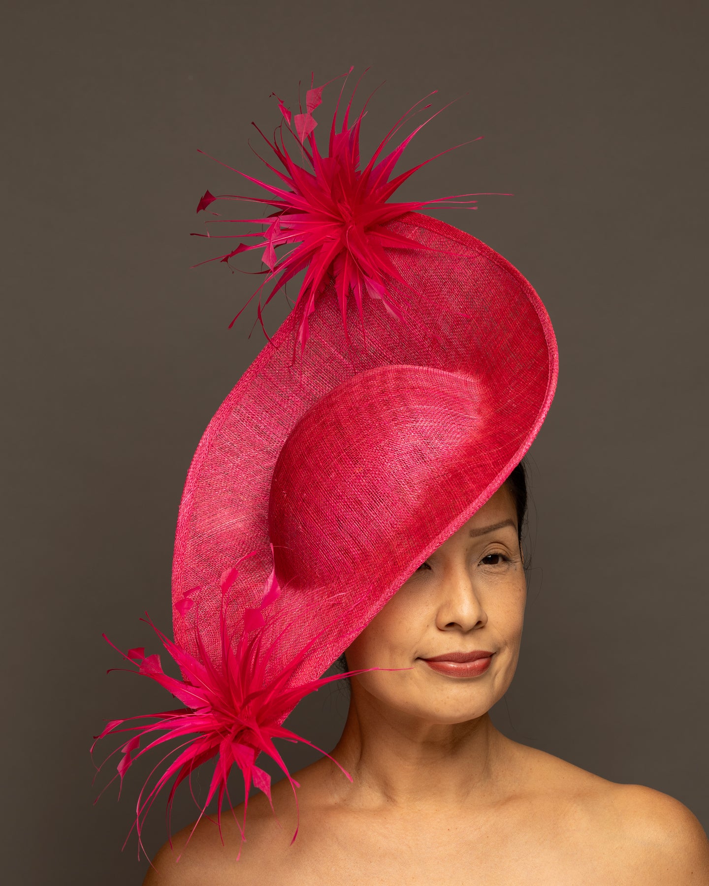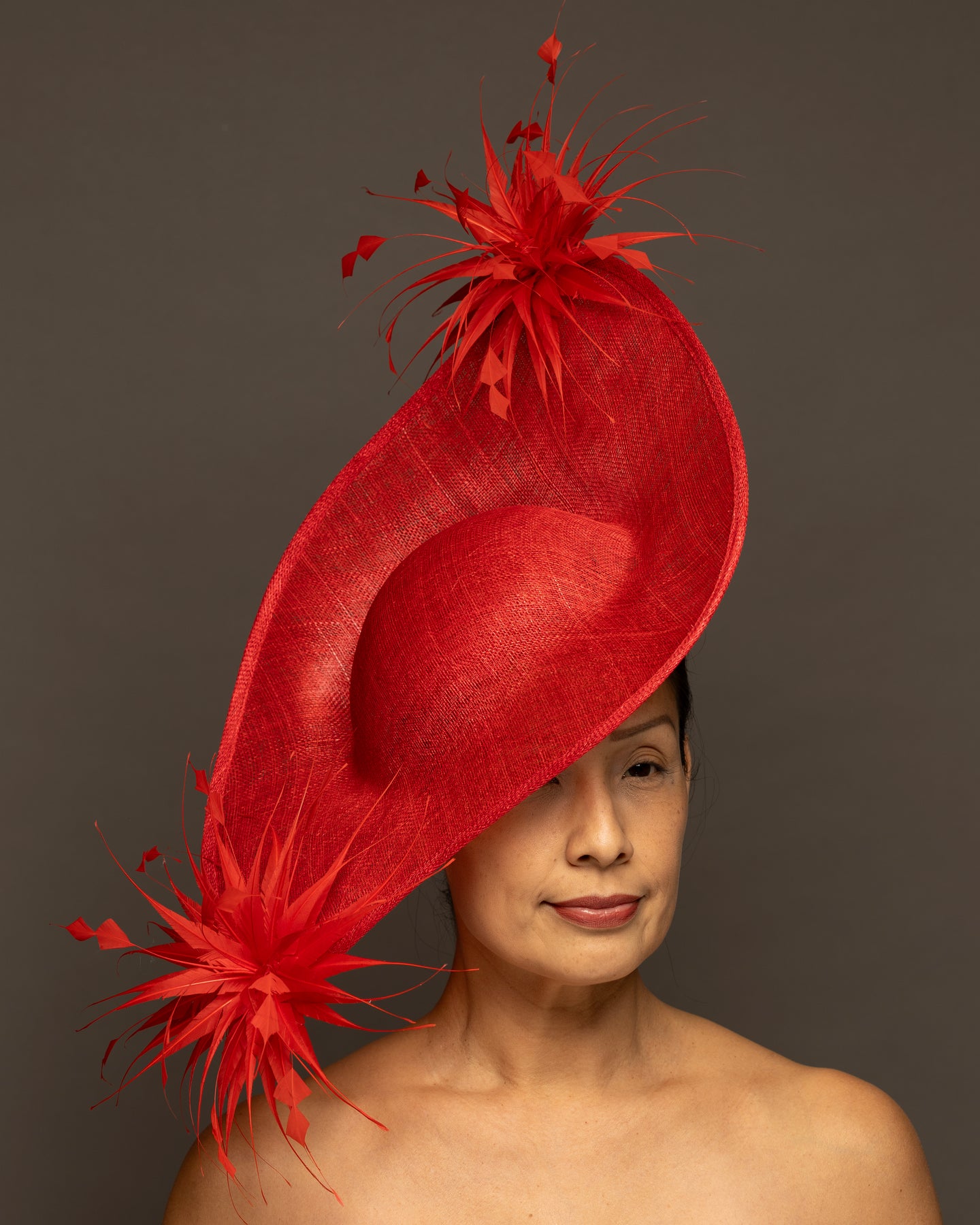 The foundation is crafted from premium sinamay, featuring a deep, woven texture that adds organic depth. The base is expertly molded into a dramatic, asymmetrical curve that sweeps elegantly across the brow and upwards toward the crown.