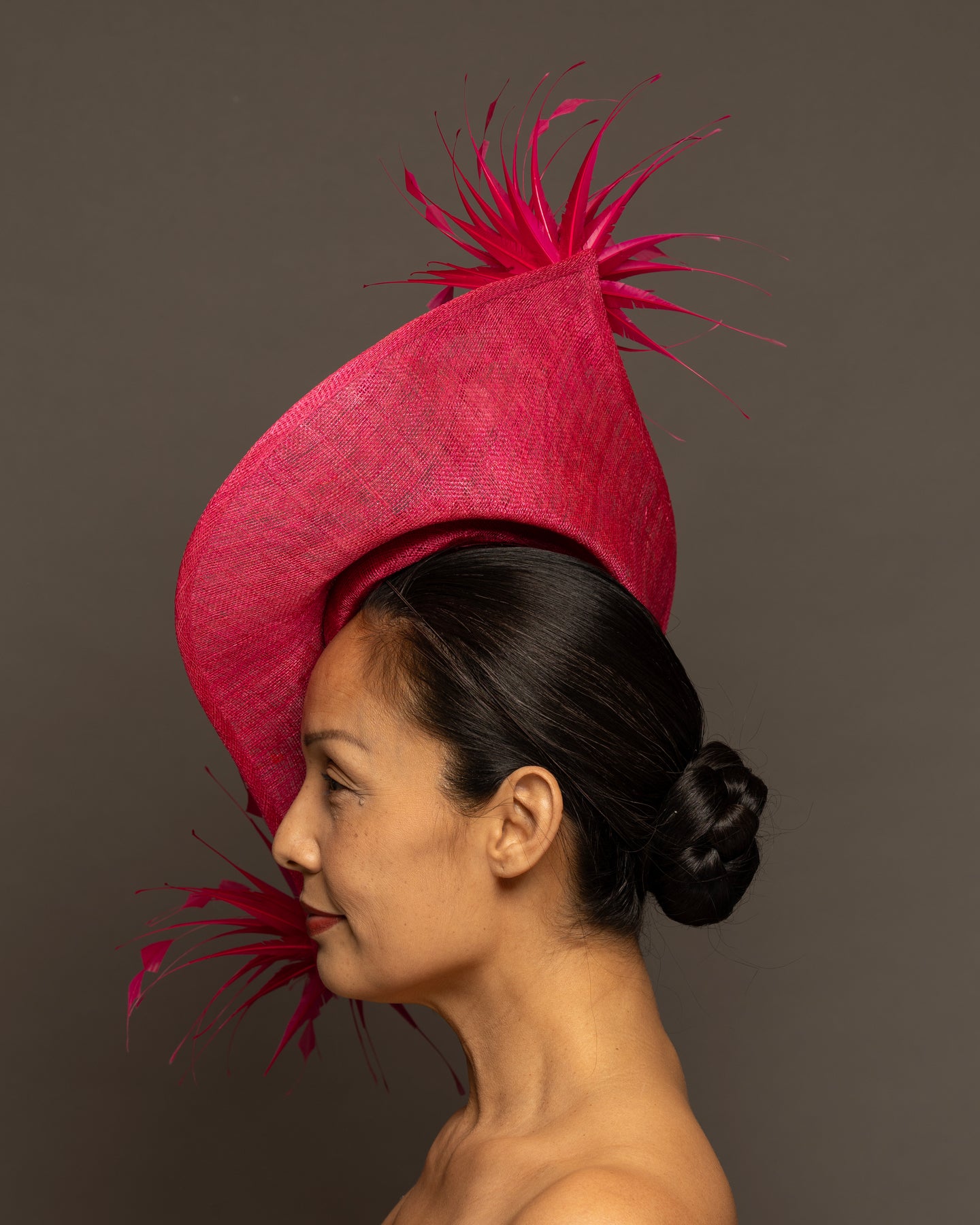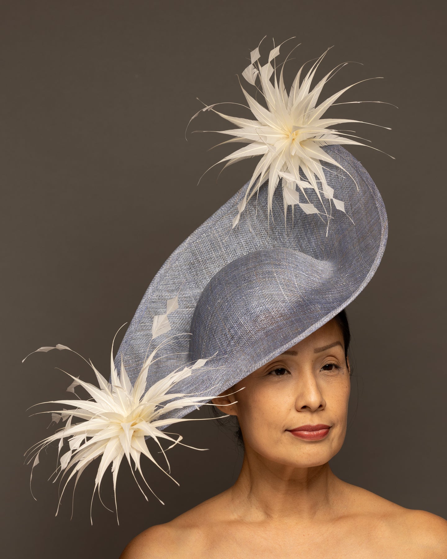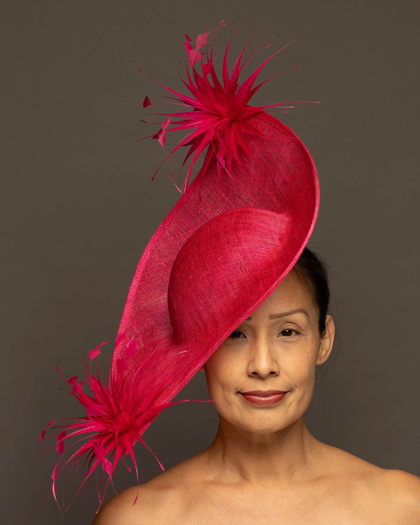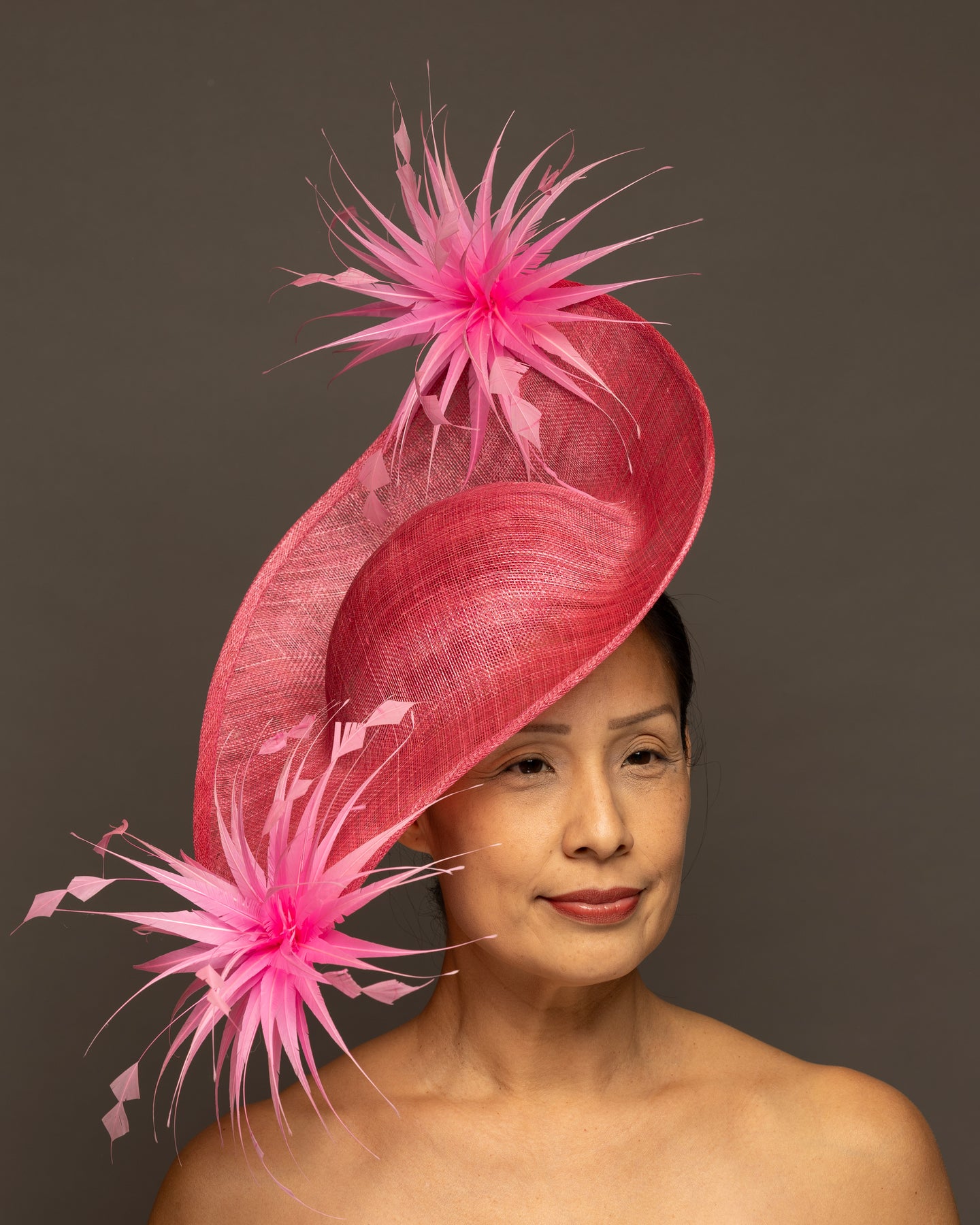 The foundation is crafted from premium sinamay, featuring a deep, woven texture that adds organic depth. The base is expertly molded into a dramatic, asymmetrical curve that sweeps elegantly across the brow and upwards toward the crown.